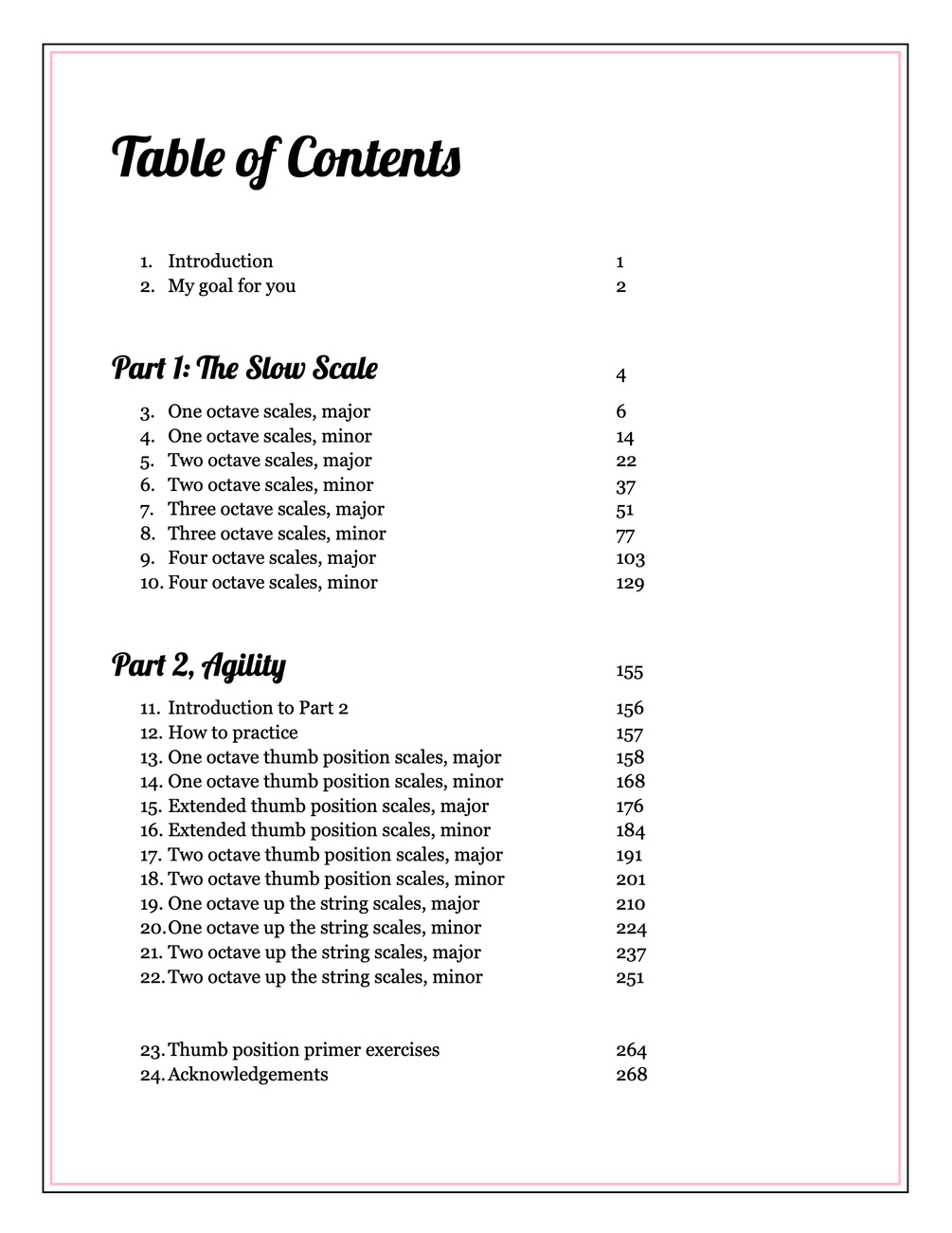 As the title suggests, this book begins at a beginner level - one-octave major scales and gradually moves to a more advanced level - two-octave thumb position scales and two-octave "up the string" scales.